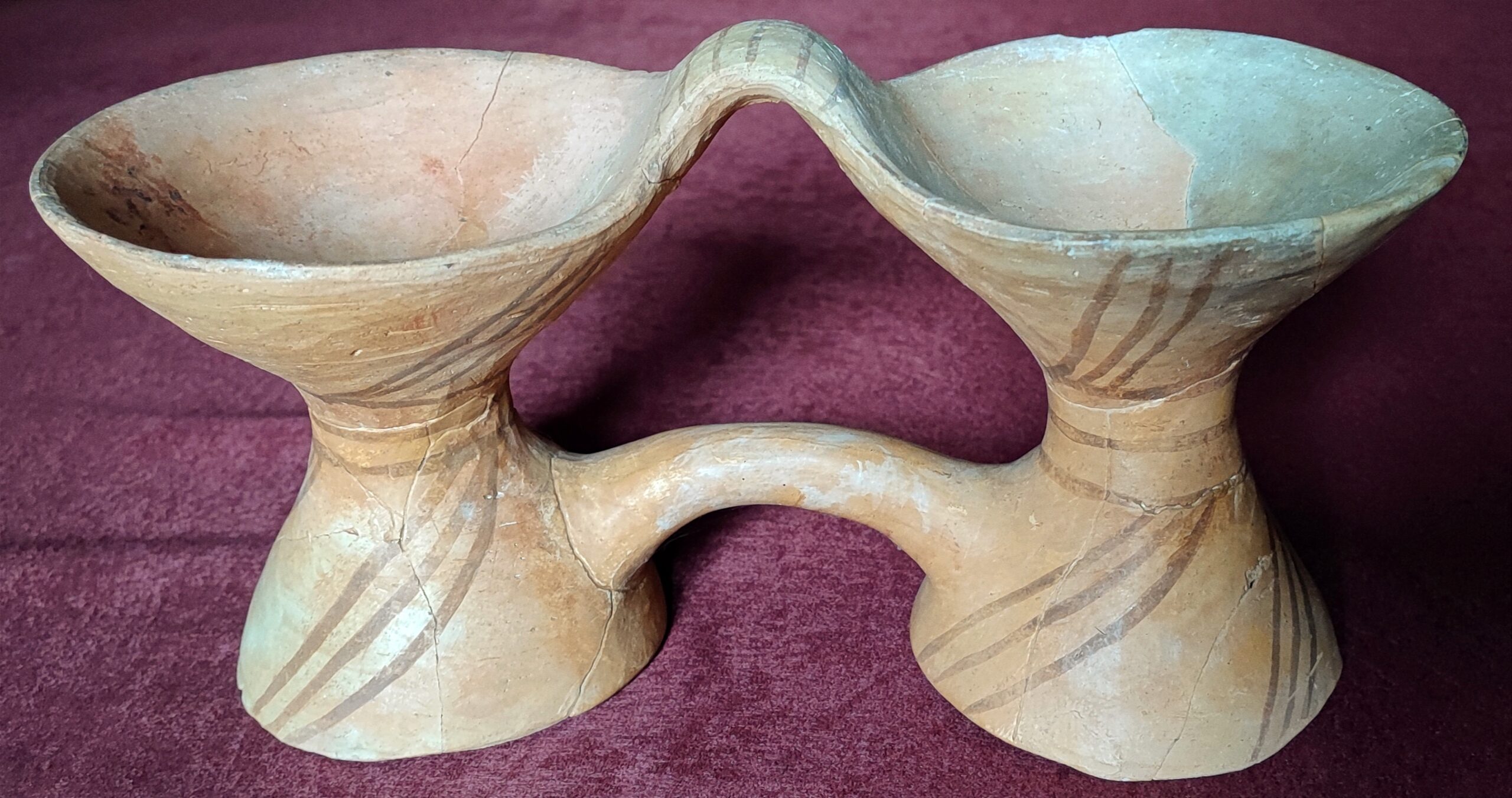 Предмет бінокулярної форми з’єднаних двома перекладинами. Кожна чашка складається з напівсферичної чаші, розміщеної на бочкоподібній ніжці. Кожна пара елементів з’єднана між собою двома поперечинами — верхня аркоподібна, нижня — дугоподібна, піднята над основою. Поверхня вкрита темно-коричневим ангобом і прикрашена парним темно-коричневим орнаментом — три по три навскісні лінії на кожній з 4-х півсфер та три лінії на бочкоподібній ніжці складають три кільця…